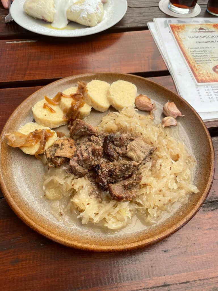 Na menu v restauraci najdete tradiční valašská jídla a minutky. První den jsme zde ochutnali valašskou kyselici, kynuté borůvkové knedlíky a jehněčí se zelím a bramborovým knedlíkem. Jídlo nám natolik chutnalo, že jsme se druhý den vrátili znovu a vyzkoušeli formanský guláš a bryndzové halušky.