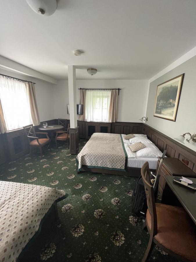 V hotelu Podhrad jsme dostali krásný pokoj s manželskou postelí a jednolůžkovou postelí. Nechybělo posezení, psací stůl, TV, minibar s občerstvením a prostorná skříň.