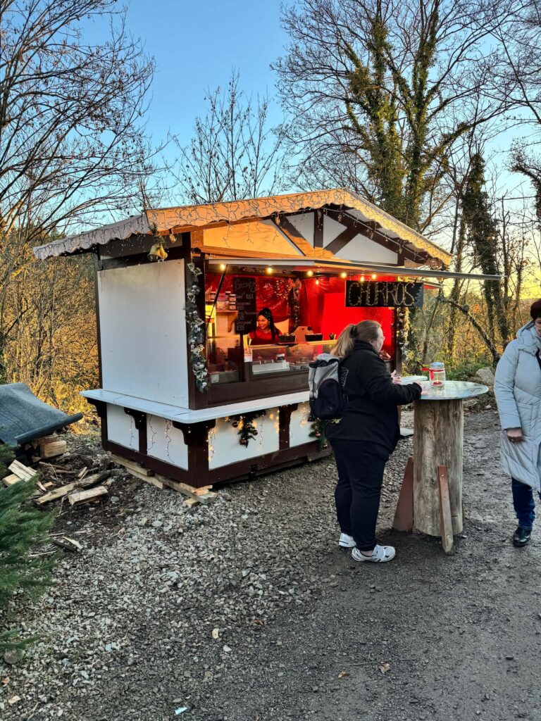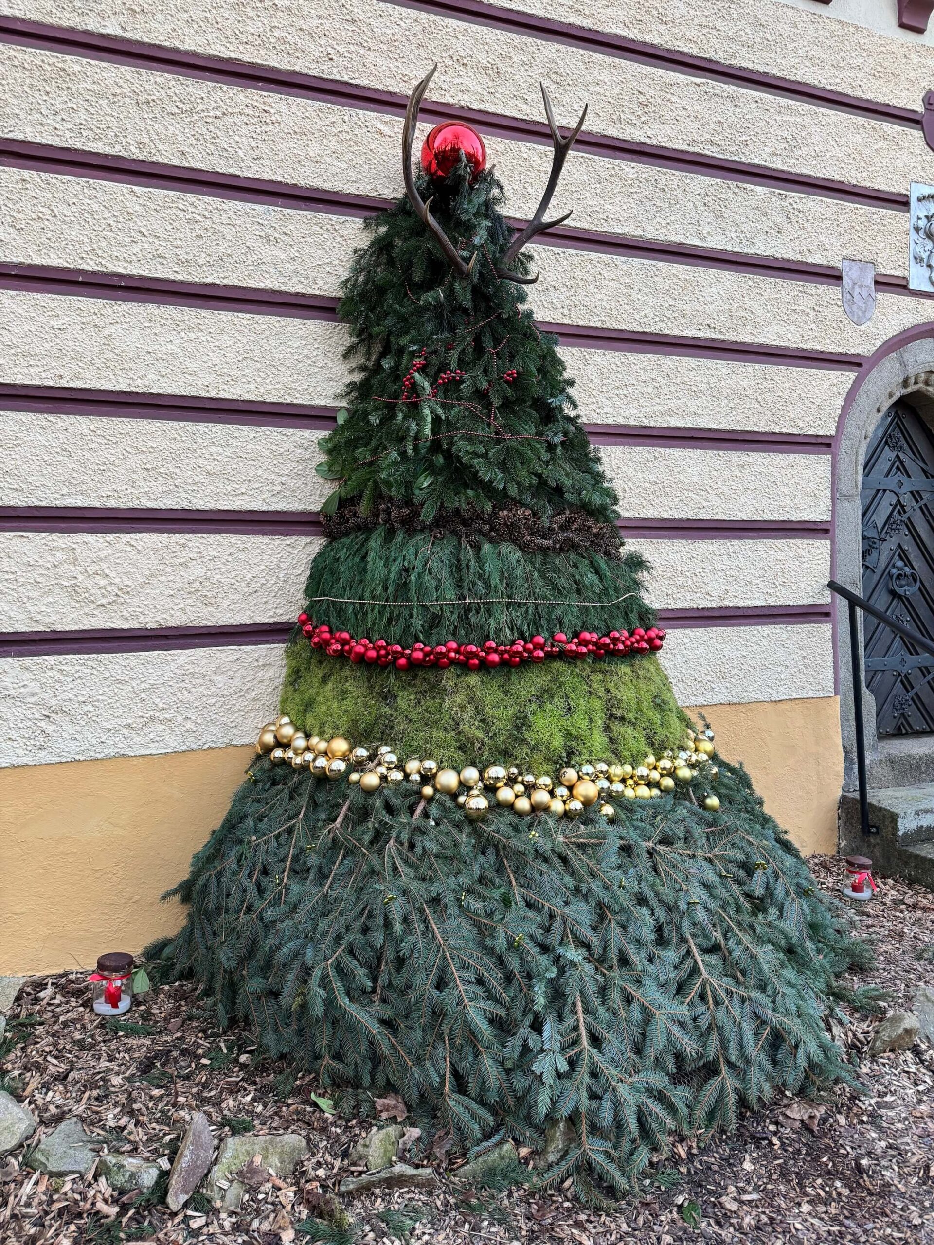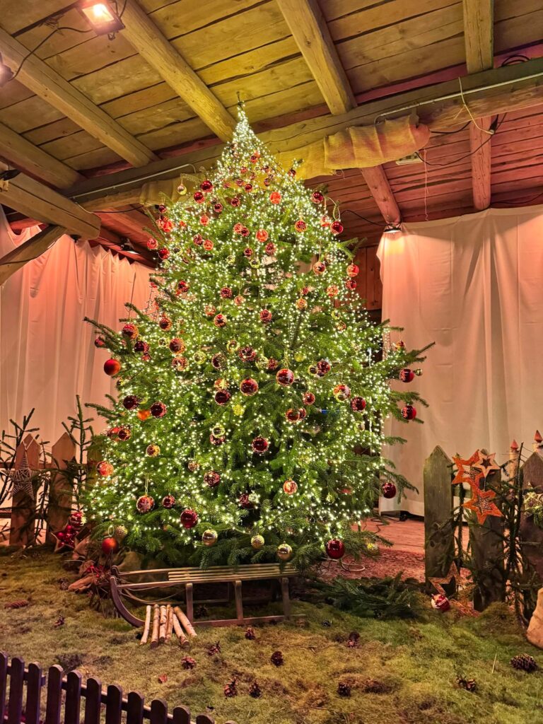 Při návštěvě trhů, nezapomeňte zavítat do místní “stodoly”, kromě dlouhých stolů, kde se můžete posadit s dobrým jídlem, zde najdete překrásný vánoční stromeček sahající téměř až do stropu budovy.