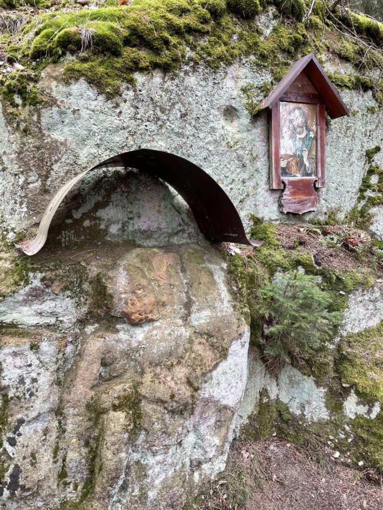 Nad kaskádou nepřehlédněte kamenného muže, který je vytesán do skály u lesní pěšiny. Nepodařilo se zjistit důvod, proč byl muž do skály vytesán, pravděpodobně se jedná o lidovou práci, ale není vyloučen ani starší původ nějakého symbolu.