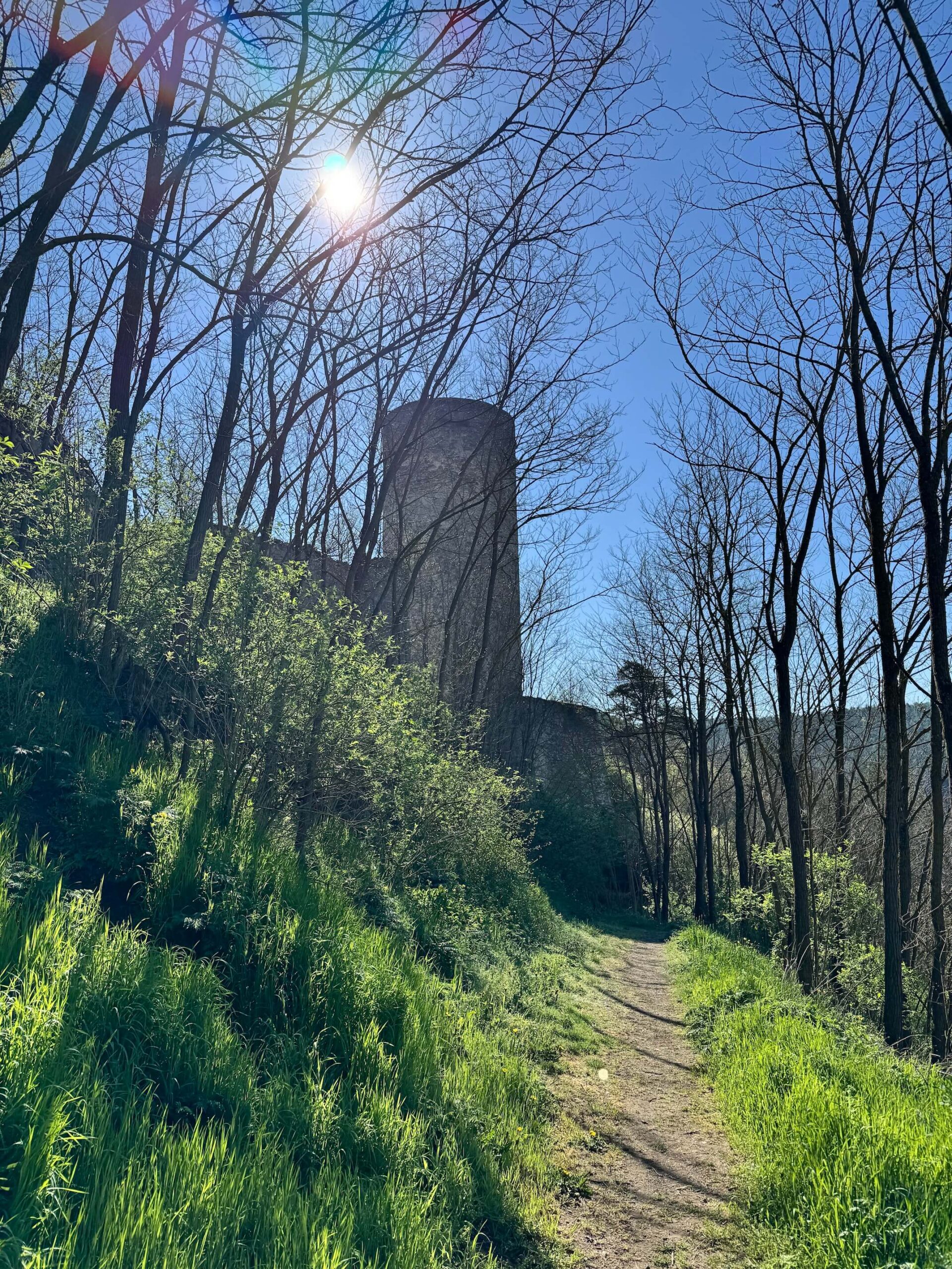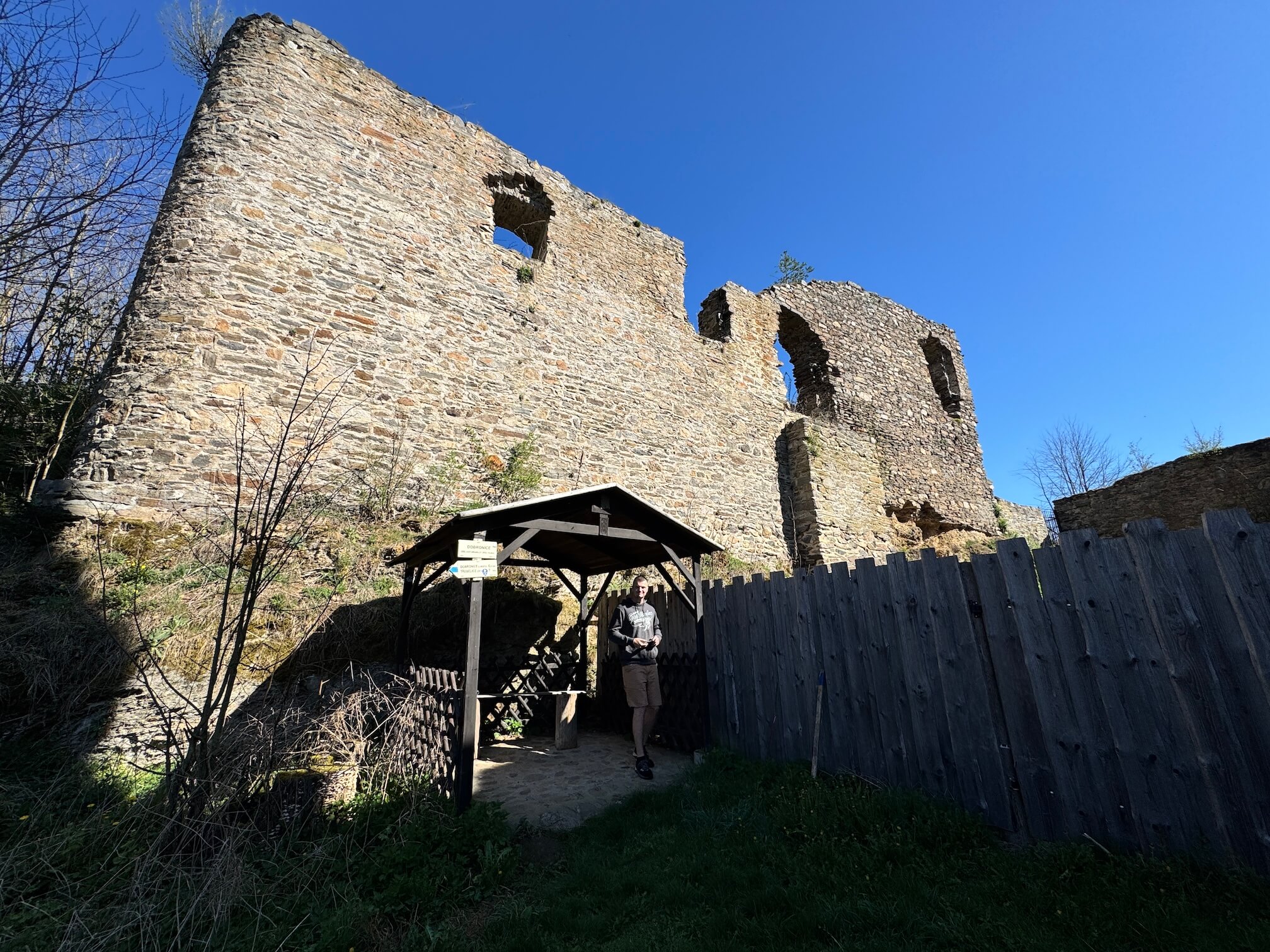 K hradu se jednoduše dostanete po červené turistické stezce. Z parkoviště je to sem opravdu kousíček (asi 200 metrů do kopce). Cesta je poměrně strmější a jsou zde i kameny, s kočárkem sem tedy nezajedete.